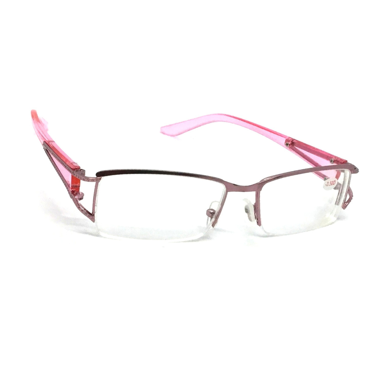 Окуляри із білою полімерною лінзою у рожевій металевій оправі. Кріплення завушника без флекс. В наявності діоптрії: